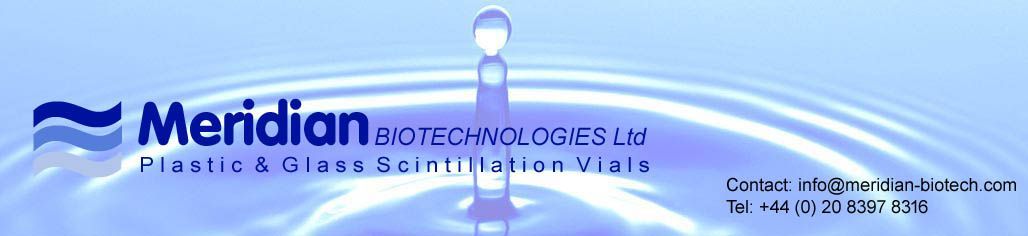 Meridian Biotechnologies Ltd. supplies an extensive range of glass and plastic vials. Glass and plastic vials are available in sizes ranging from 6mL up to 20mL. This maximum of 20 ml is fixed due to the dimensions of currently used photomultiplier tubes (1½ inch diameter). It is important to remember that when the cocktail + sample is added to the vial then the vial becomes an integral component of the counting process.